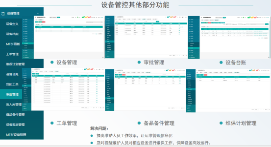 • 设备全生命周期管控:涵盖设备档案、维保计划、工单管理、备品备件管理,保障设备有效运行;