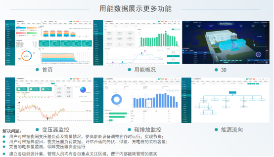 • 用能数据可视化:自定义驾驶舱、报表与组态图,直观呈现能耗趋势、碳排放量、变压器状态等关键信息;