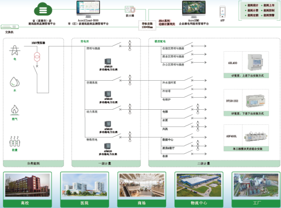 安科瑞响应政策要求,构建了准确的公共建筑能耗监测体系:按电量、水耗量等能源种类,及照明插座、空调、动力等用途进行分项计量,搭配单相、三相全系列电能表(涵盖导轨式、嵌入式安装方式),适配变电所、楼层配电、特殊用电等不同场景,数据精度达0.2S级~0.5级,为能耗分析提供可靠依据。